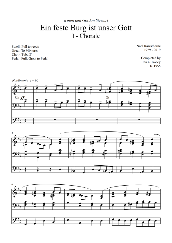 The second Chorale Fantasie was dedicated ‘a mon ami Gordon Stewart’ but was unfinished at the time of Noel’s death in 2019. Having spent many years in the loft with Noel as Organ Scholar and Assistant Organist and having heard many of his chorale improvisations, Ian Tracey completed the Fantasie and gave its first performance at the 94th Anniversary Recital in 2020. The piece takes the form of five variations on the Lutheran chorale, harmonised by J S Bach and used in his Cantata 80. The fanfare motif employed in the final variation appropriately quotes from his Blackburn Service commissioned by the Dean & Chapter of Blackburn Cathedral in 1996.