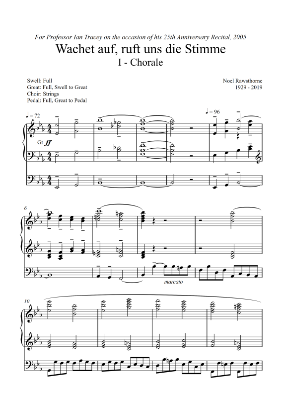 Dedicated ‘To Ian Tracey on the occasion of his 25th Anniversary Recital as Organist of Liverpool Cathedral’ this was premiered at the 79th Anniversary Recital and heard again at Noel’s memorial recital in October 2019. The music takes the form of five variations on the Lutheran chorale, harmonised by J S Bach and used in his Cantata 140. The fanfare motif employed in the final variation nostalgically quotes from his Liverpool Service commissioned by the Dean and Chapter of Liverpool Cathedral in 1992.